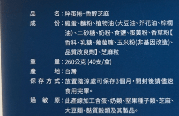 - 該食品含有或可能含有的過敏原包括:蛋、奶類、堅果種子類、芝麻、大豆類、麩質穀類。